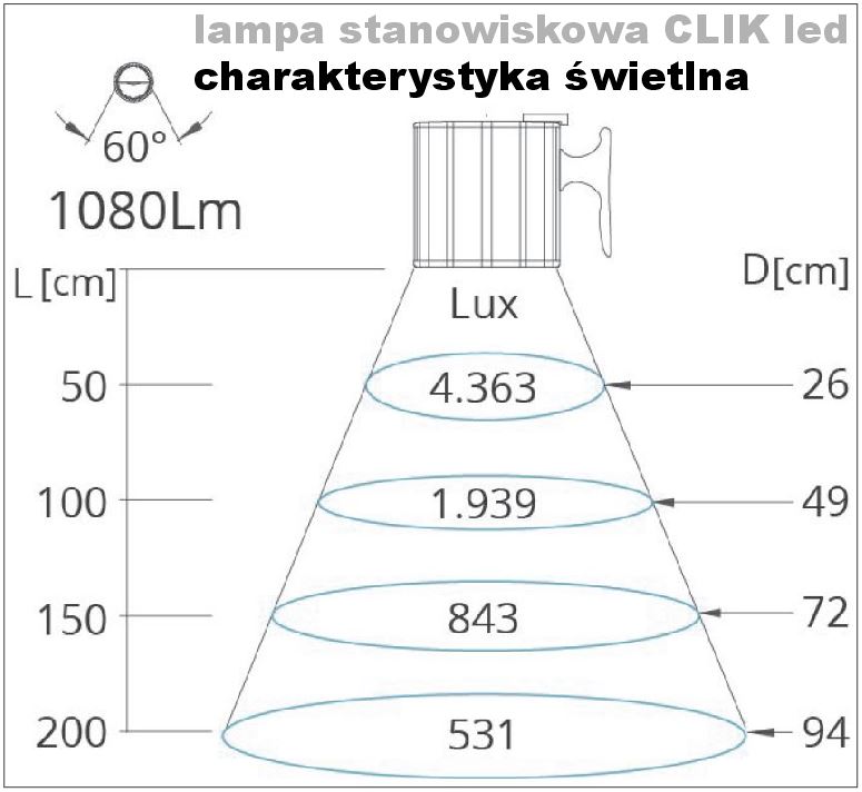 Charakterystyka świetlna lamp serii CLIK - natężenie oświetlenia, w zależności od ustawienia lampy: